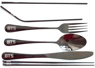 Kpop BTS Bangtan Boys Travel Camping Cutlery Set - Portable Lunch Utensils Set with Case and Straw, Straight Straw, Knife, Fork, Spoon, Chopsticks, Cleaning Brush 8 Piece (Black)