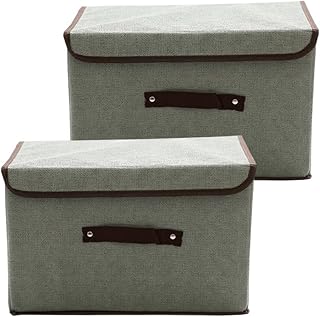 Valease 2パック 大きなリネン生地 折りたたみ式収納容器 蓋とハンドル付き 洗える収納ボックス バスケットキューブ 取り外し可能な仕切り付き 寝室 クローゼット オフィス リビングルーム 保育園用 L グリーン