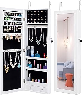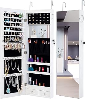 Baysitone ジュエリーオーガナイザー レディース ジュエリーアルモア 全長ミラーと6個のLED付き 壁/ドアマウントジュエリーキャビネット 引き出し2つ付き 吊り下げジュエリーオーガナイザー アルモアジュエリーボックス(ホワイト)