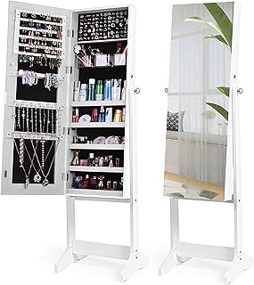 ZenStyle スタンディング ロック可能 ジュエリー アルモア オーガナイザー フルレングス 鏡付き ドレッシング ジュエリーキャビネット 棚5枚付き 大きなストレージ容量 4角度調節可能 ホワイト