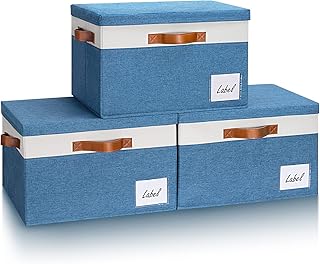LHZK 収納ボックス ふた付き 3点セット 折りたたみ式 収納ケース 合成皮革ハンドル付き 分類用ラベル 丈夫なキャンバス生地 ボックス 大容量整理用 カラーボックス 幅38×奥行28×高さ24.7cm (ブルー)